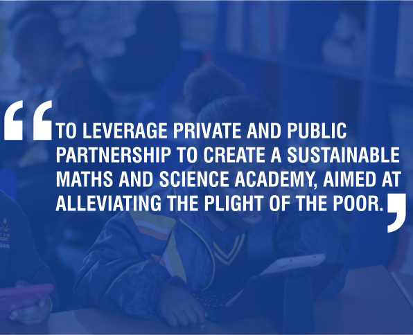 - To leverage private and public partnership to create a sustainable Maths and Science Academy, aimed at alleviating the plight of the poor